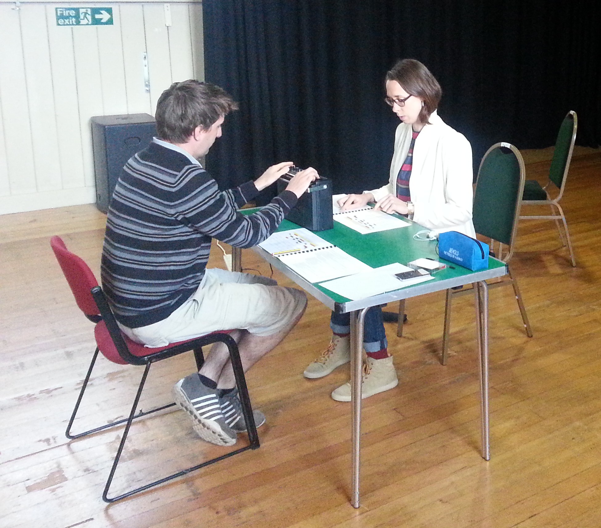 On Tuesday 25 August Juliet and I recorded the tape parts for my piece, Scantlebury, in the theatre at the Pound. Recording at the Pound in the space in which the piece will be first performed was very special. We were in there all day and managed to record everything we needed to. This was my first experience of a recording session, albeit a slightly more ‘homemade’ format than one might usually expect. This was due to the lo-fi equipment that I am using for my piece, which is for Soprano and tape recorder.